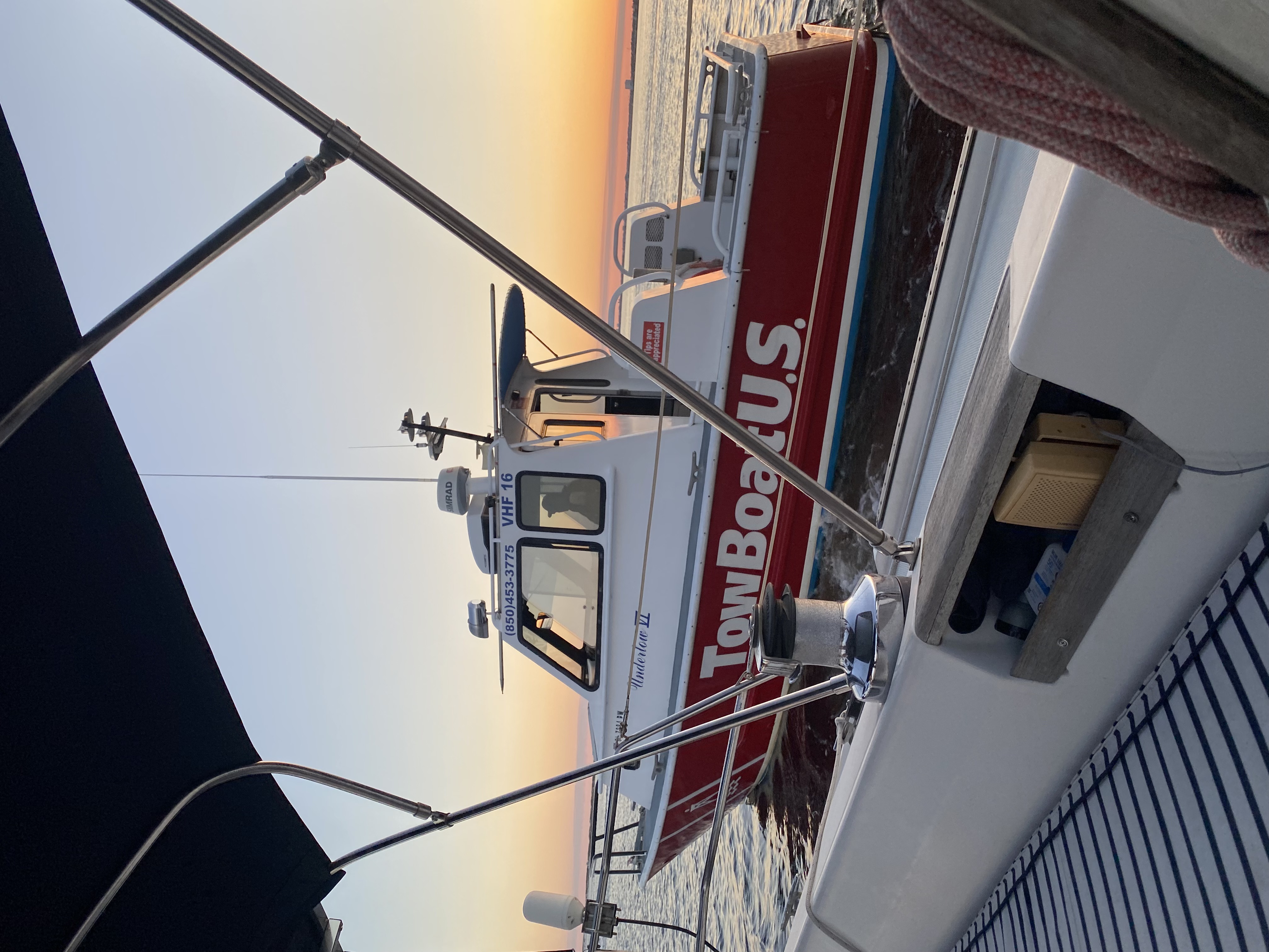 We were trying to find an anchorage and then there was a big jolt and then we couldn’t get unstuck out of this mess! We kept on moving around and then we grounded* again! We were trying to get the motor to get us out, but then the rudder got stuck and we couldn’t move. We took a pause, then we called towboat-us. We got out some hot dogs and grilled, and at about 7:15 we were free and on our way to get to a better anchorage.